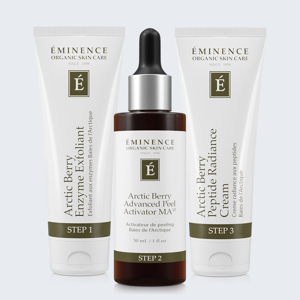 Illuminate your complexion with this treatment set that reduces the appearance of wrinkles and discoloration. Keep your skin radiant in-between spa treatments with this innovative three-step peel and peptide system which awakens the skin’s natural inner beauty using an exquisite blend of arctic berries, lingonberry seed oil and hibiscus seed extract.
