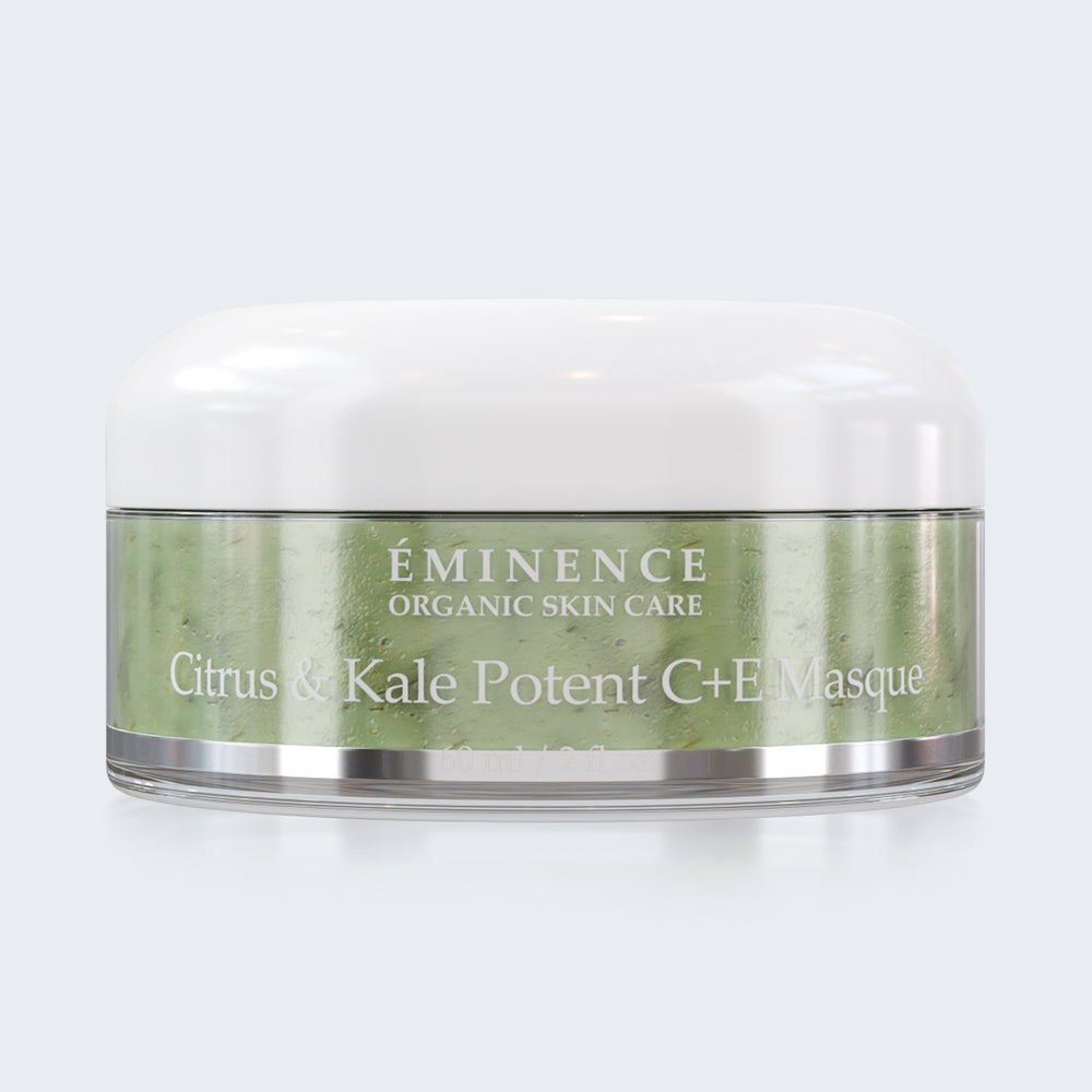 The Eminence Citrus & Kale Potent C+E Masque is a potent, cream-gel masque for all skin types. Harness the natural power of Vitamins C+E with a boost of nourishing vitamins for the skin. A cocktail of citrus, rhubarb extract, leafy greens and avocado oil forms helps reduce the appearance of sun damage and fine lines and wrinkles.