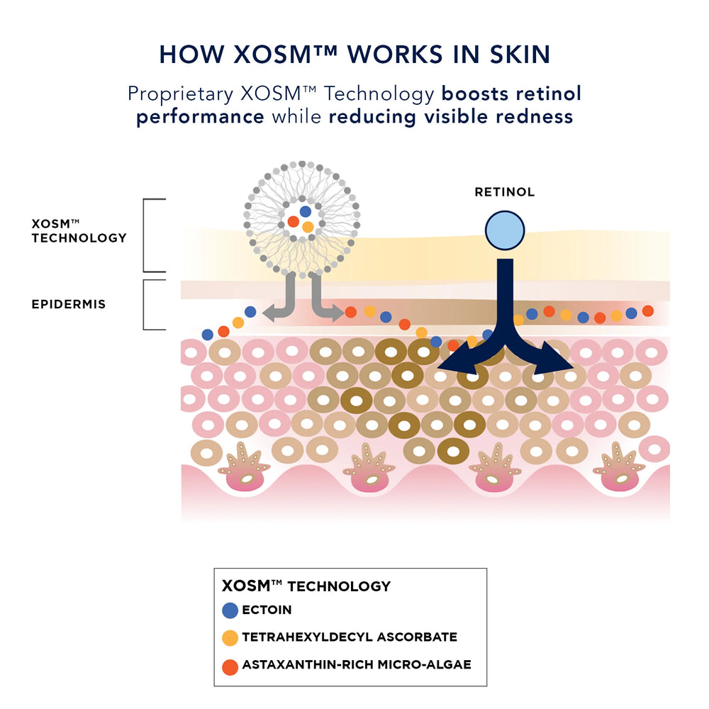 Proprietary, patent-pending XOSM™ Technology with smart-encapsulation of antioxidants boosts the performance of retinol and works synergistically with a blend of soothing ingredients to diminish the look of redness while protecting and nourishing the skin’s barrier. See visible improvement in the appearance of brightness, fine lines & wrinkles, pores, pigmentation and skin firmness - while being kind to skin. Formulated for nightly use to achieve best results.