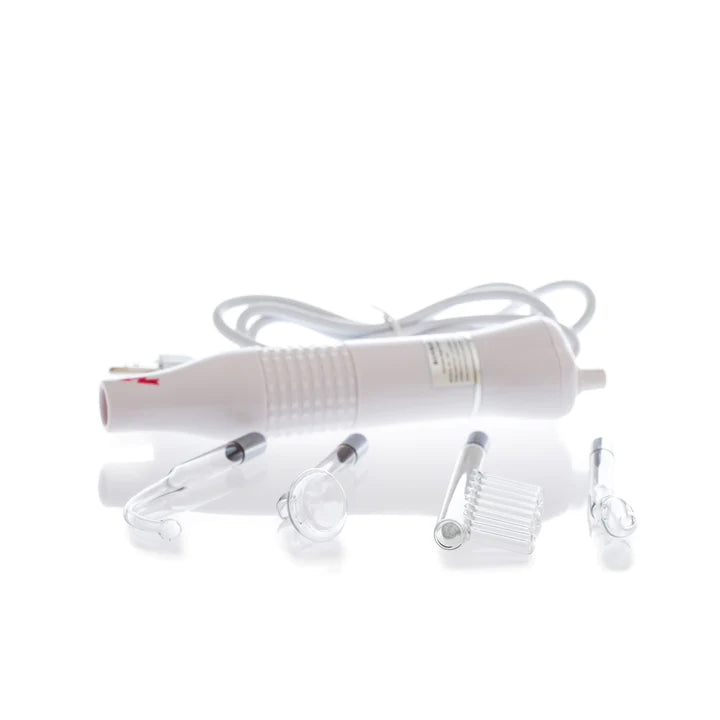 Experience soothing, healing facial treatments with the Saian Portable High-Frequency Set. This innovative, hand-held device is tailor-made for beauty and skincare pros who want to offer a rewarding relaxation experience. It has four glass electrodes: three neon orange and one argon violet. When applied to the skin or scalp, a mild current passes through these light bulbs, bathing your customers in a calming, orange-red, or warm purple glow - delivering penetrating relief to common facial ailments.