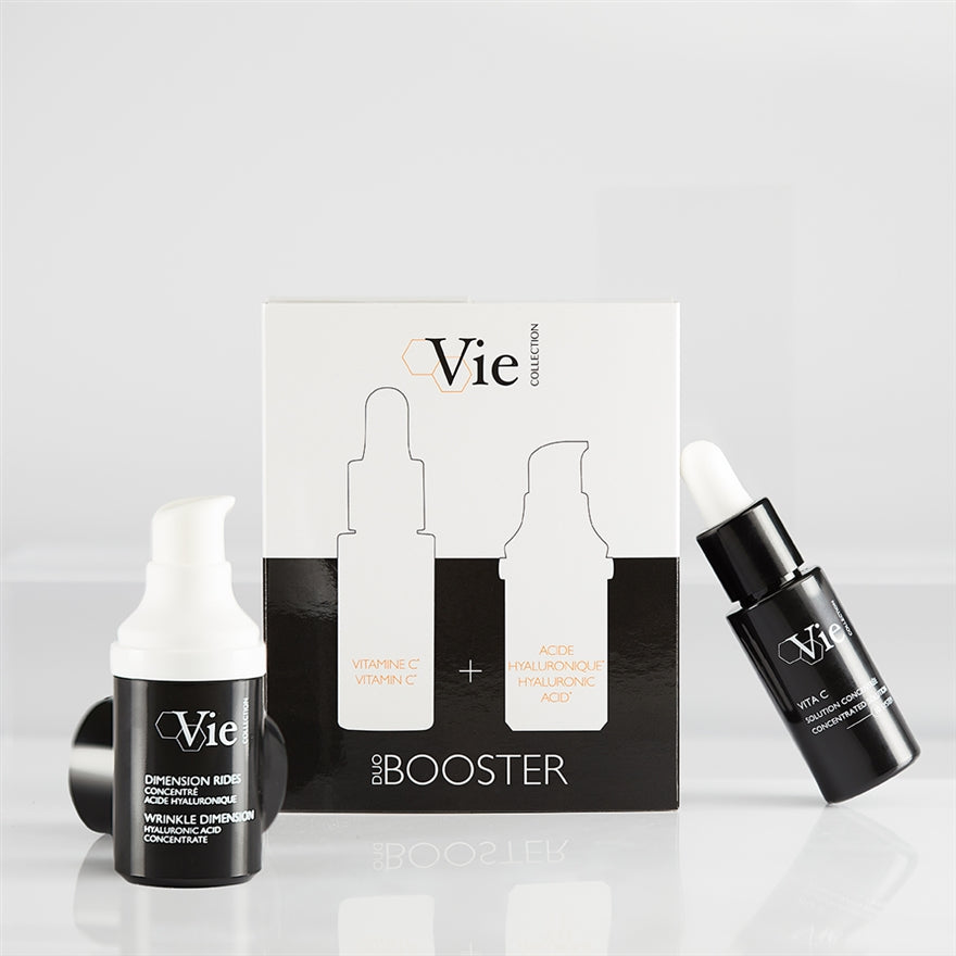 The Vie Booster Duo is the perfect way to fight wrinkles and signs of aging! This duo includes the Wrinkle Dimension Hyaluronic Acid Concentrate and Vita C Concentrated Solution, which work together to amplify your youth-restoring results.